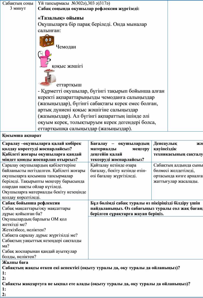 Үй тапсырмасы №302ә),303 ә)317ә) Сабақ соңында оқушылар рефлексия жүргізеді: «Тазалық» ойыны Оқушыларға бір парақ беріледі. Онда мыналар салынған: