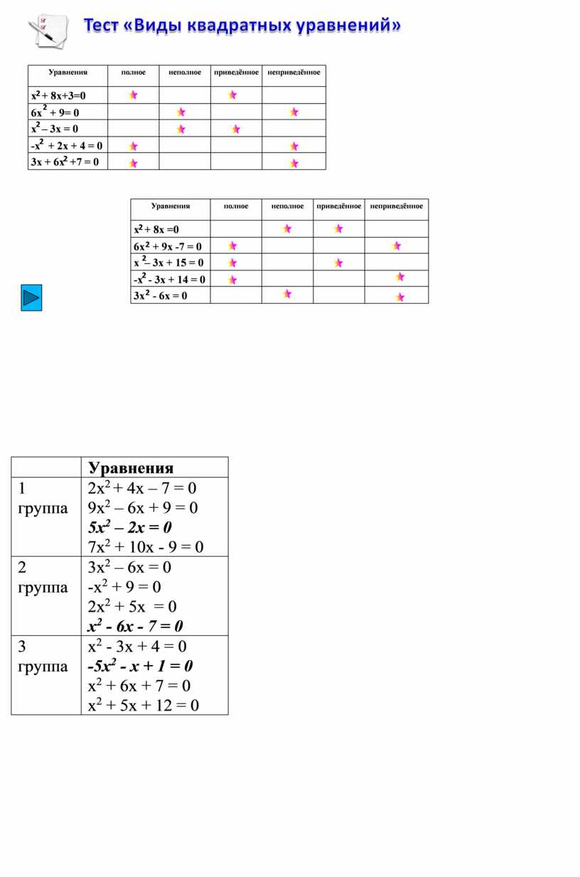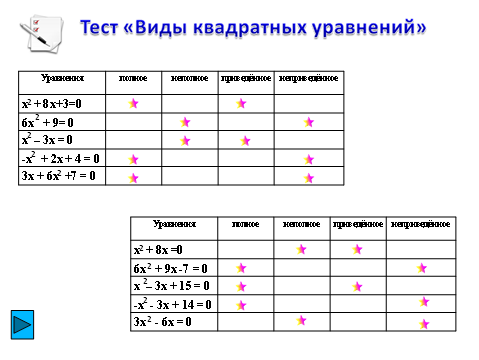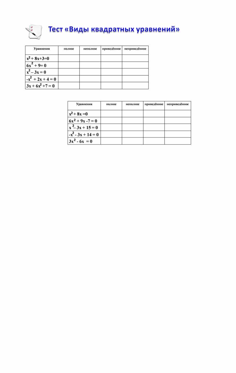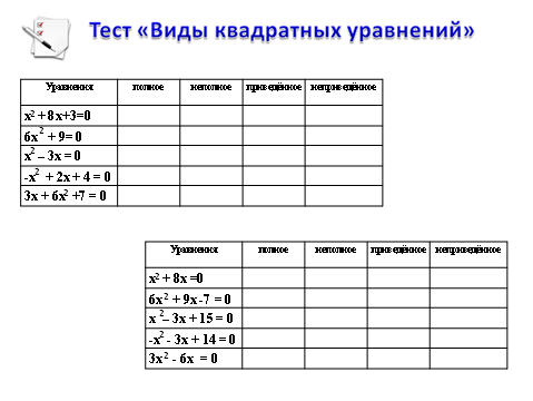-Теперь давайте проверим, насколько хорошо вы умеете определять виды квадратных уравнений. Вашему вниманию предлагается тест, в котором нужно определить вид пяти предлагаемых уравнений. Напротив каждого уравнения вы ставите «плюс» в той колонке, какому виду оно принадлежит (слайд)