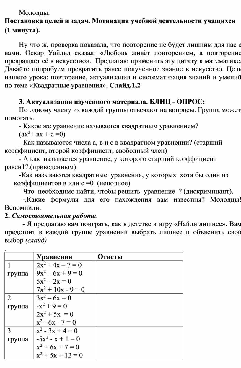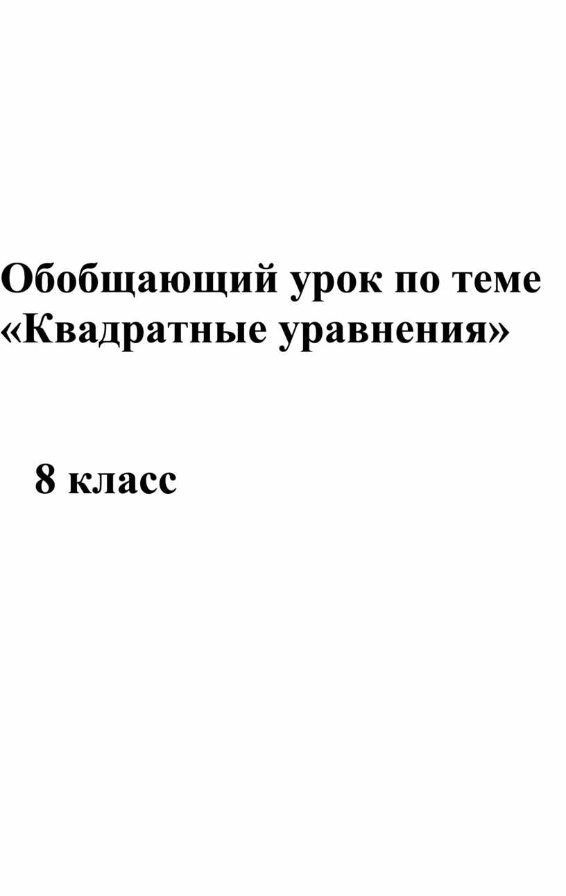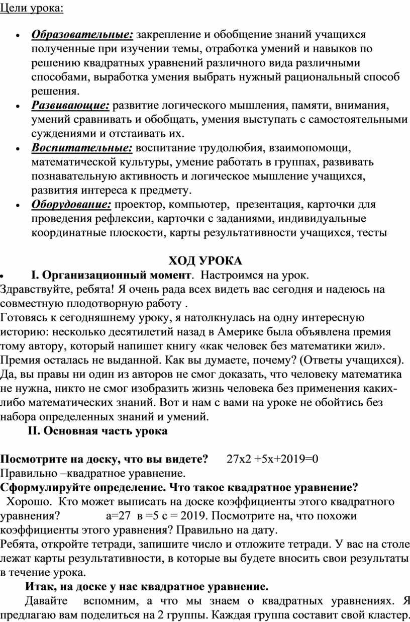 · Образовательные: закрепление и обобщение знаний учащихся полученные при изучении темы, отработка умений и навыков по решению квадратных уравнений различного вида различными способами, выработка умения выбрать нужный рациональный способ решения.