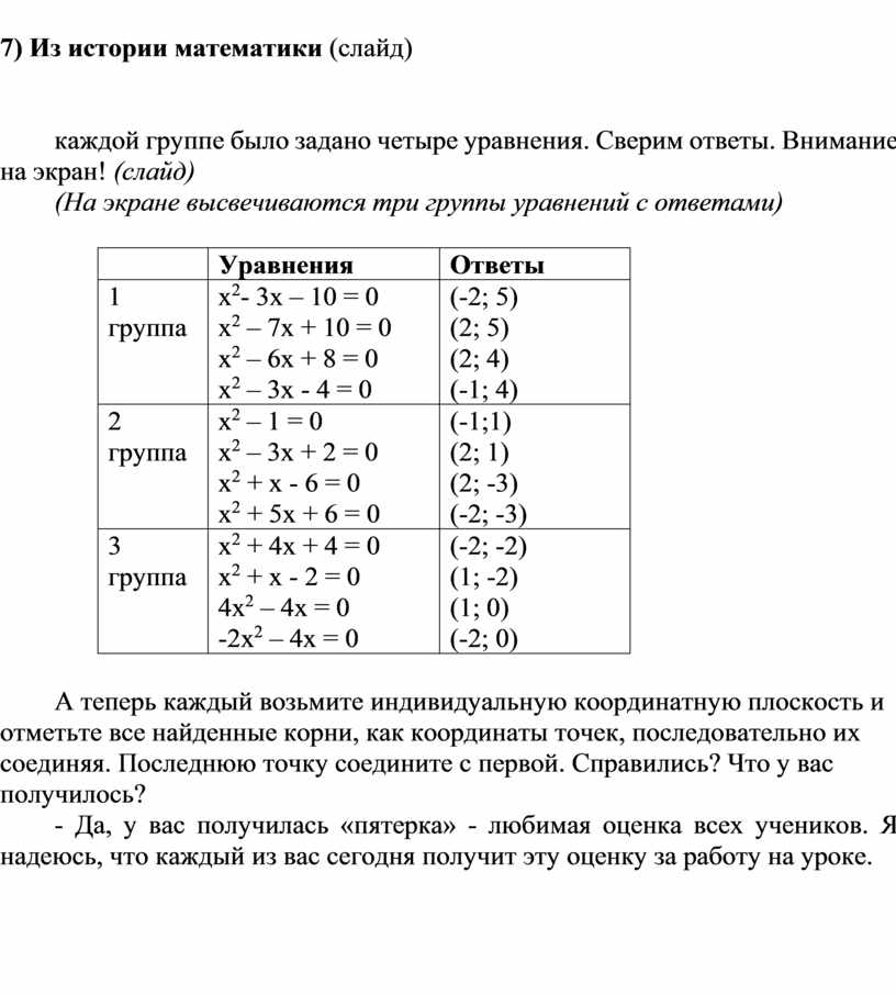 А теперь каждый возьмите индивидуальную координатную плоскость и отметьте все найденные корни, как координаты точек, последовательно их соединяя. Последнюю точку соедините с первой. Справились? Что у вас получилось?