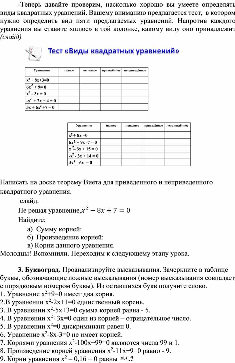 Написать на доске теорему Виета для приведенного и неприведенного квадратного уравнения.