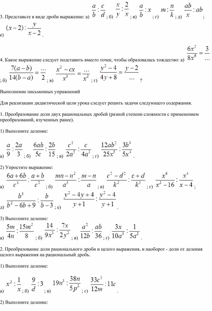 1. Преобразование доли двух рациональных дробей (разной степени сложности с применением преобразований, изученных ранее).