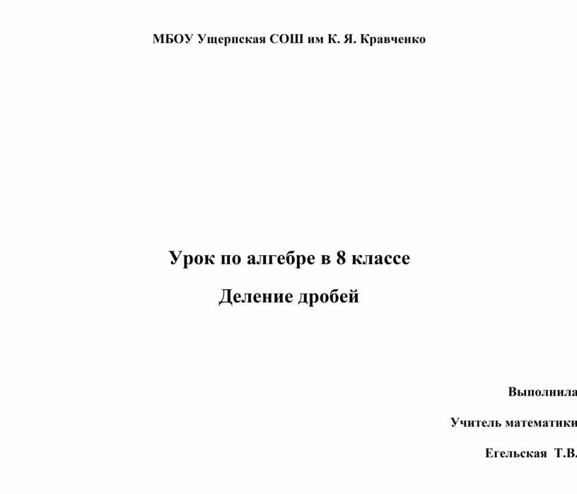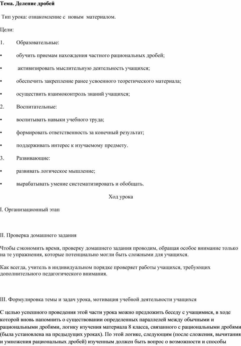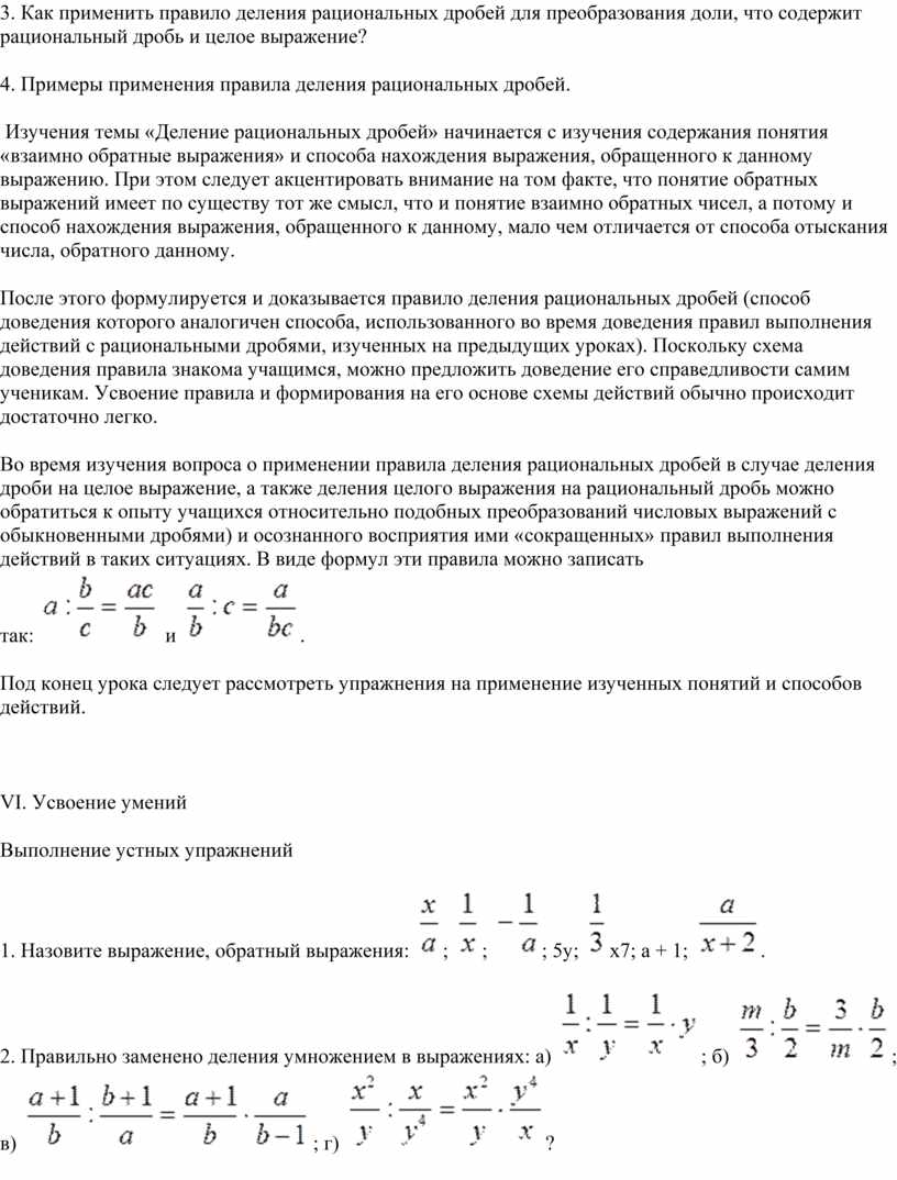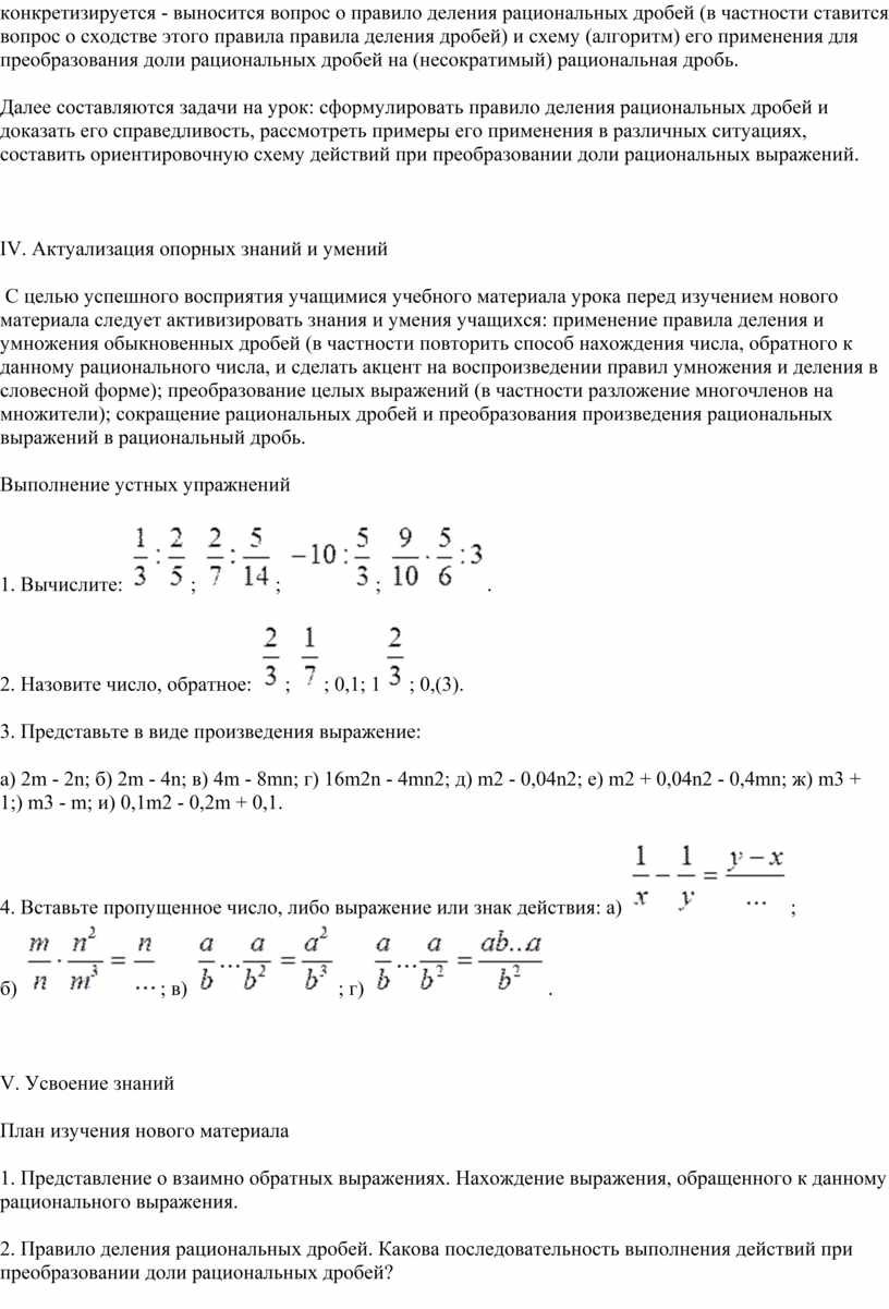 Далее составляются задачи на урок: сформулировать правило деления рациональных дробей и доказать его справедливость, рассмотреть примеры его применения в различных ситуациях, составить ориентировочную схему действий при преобразовании доли рациональных выражений.