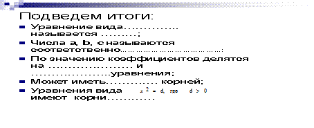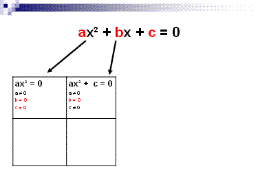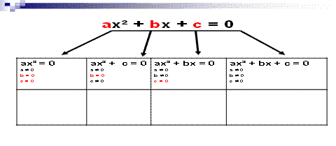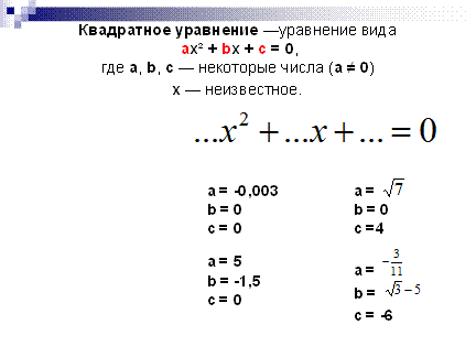 - Как называются числа а и с, какие значения они могут принимать? ( Это коэффициенты уравнения, они могут быть любыми, кроме случая, когда а = 0)