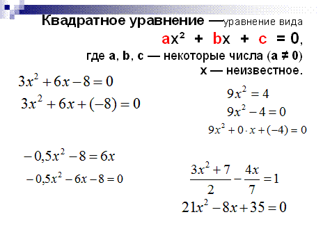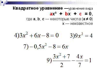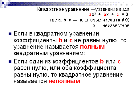 Квадратным уравнением называется уравнение вида ах2 + bх + с = 0, где а, b, с – заданные числа, а ≠ 0.