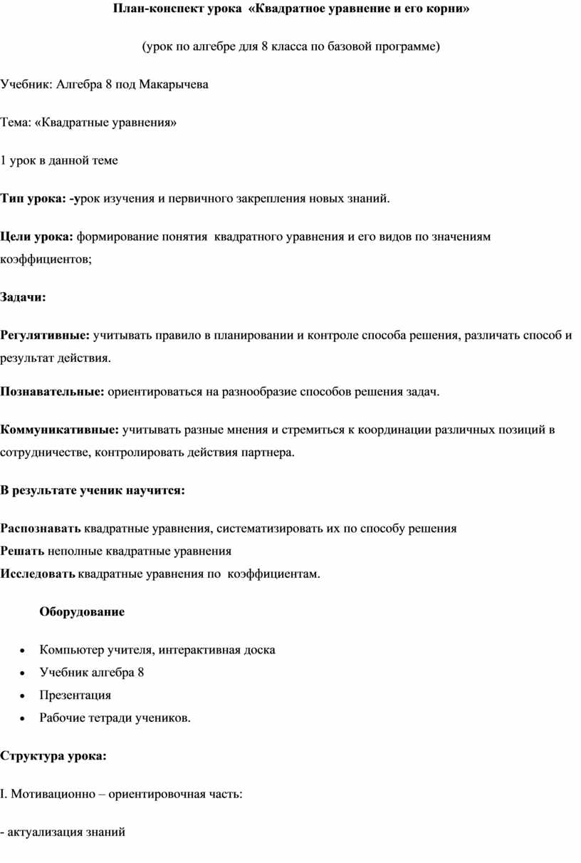 Приготовьте все необходимое к уроку: учебник, тетрадь, дневник. Сегодня…..число. Тема сегодняшнего урока «Квадратное уравнение и его корни»