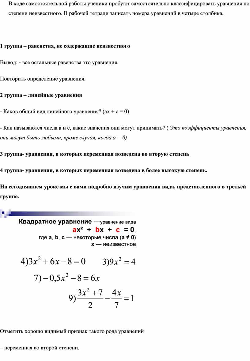 3 группа- уравнения, в которых переменная возведена во вторую степень