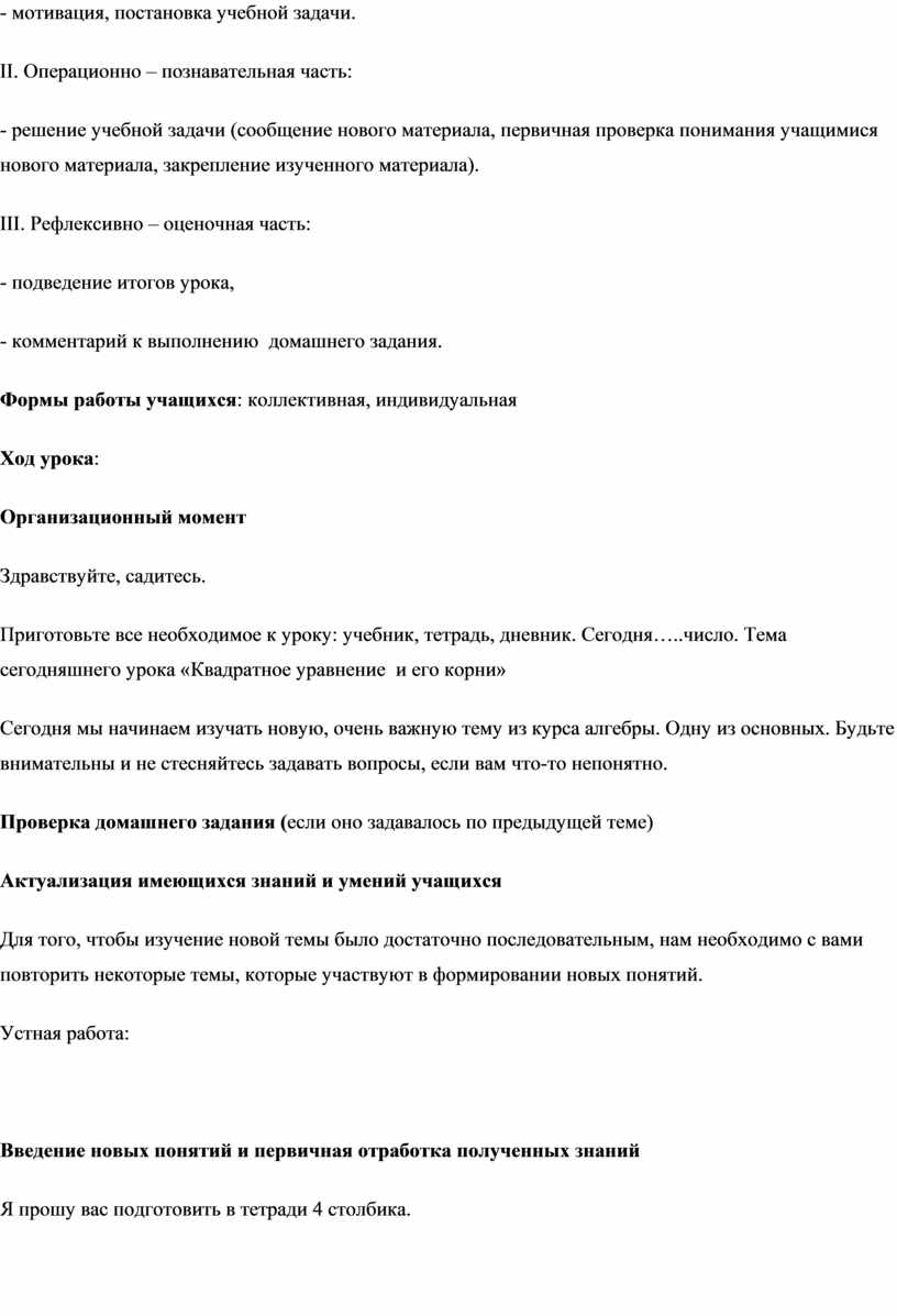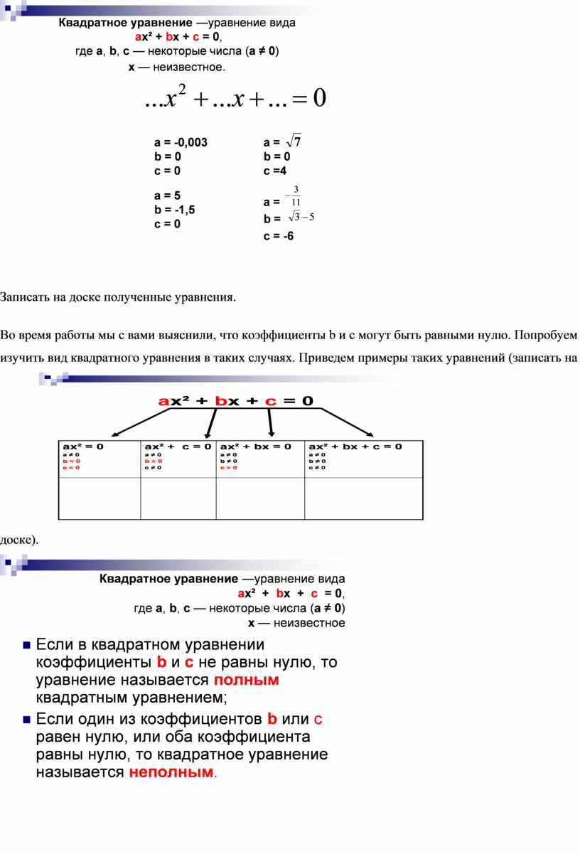 Цели урока: формирование понятия квадратного уравнения и его видов по значениям коэффициентов;