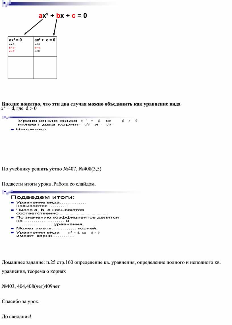 Домашнее задание: п.25 стр.160 определение кв. уравнения, определение полного и неполного кв. уравнения, теорема о корнях