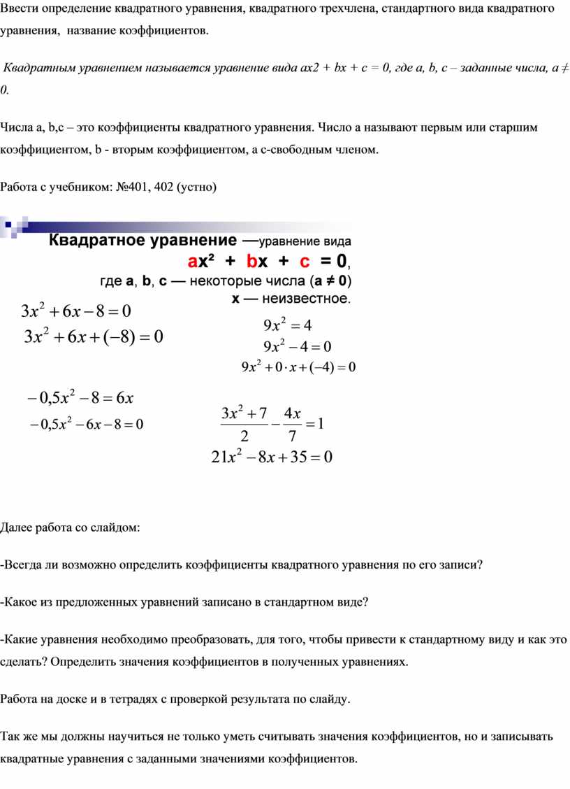 Ввести определение квадратного уравнения, квадратного трехчлена, стандартного вида квадратного уравнения, название коэффициентов.