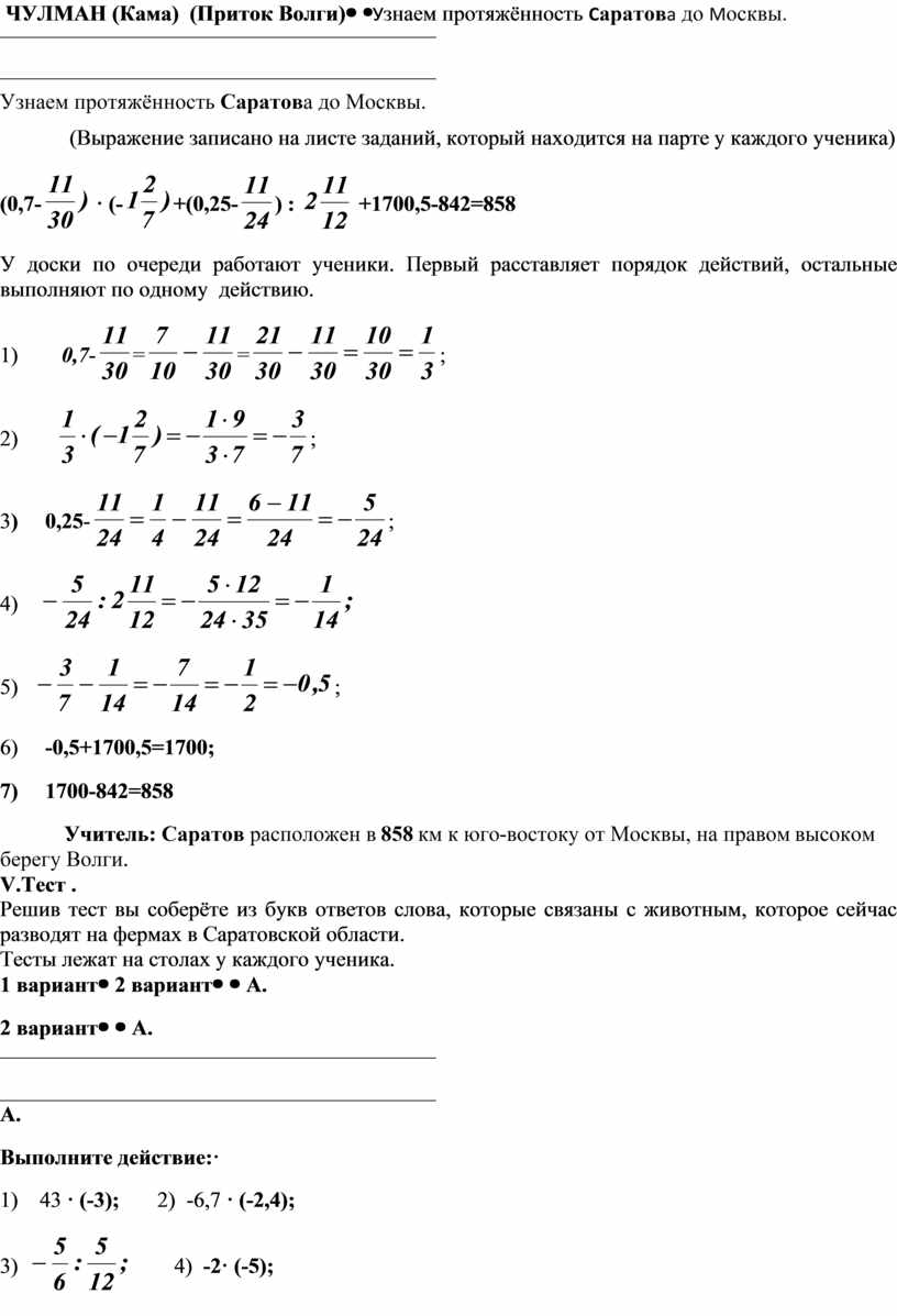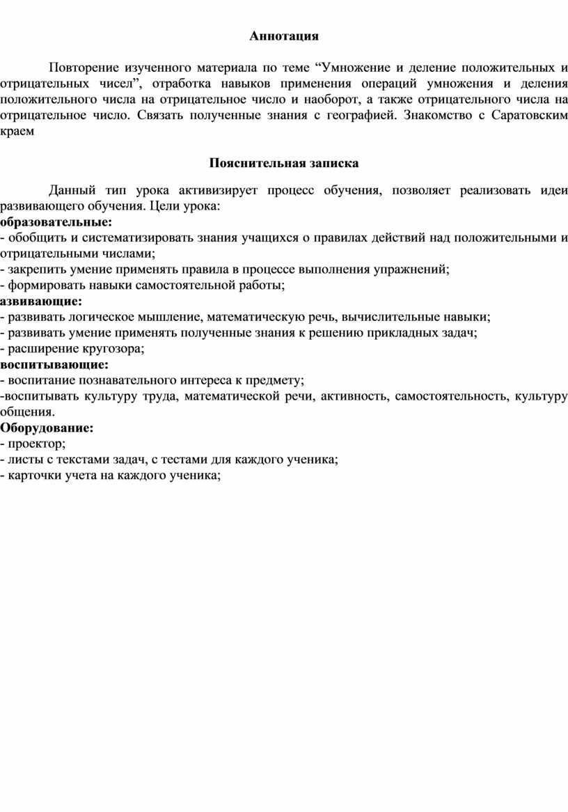 Повторение изученного материала по теме “Умножение и деление положительных и отрицательных чисел”, отработка навыков применения операций умножения и деления положительного числа на отрицательное число и наоборот, а также отрицательного числа на отрицательное число. Связать полученные знания с географией. Знакомство с Саратовским краем