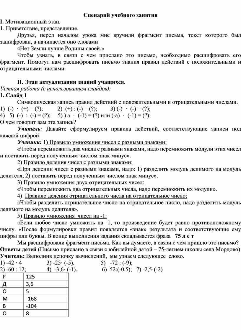 «Если любое число умножить на -1, то произведение будет равно противоположному числу. «После формулировки правил появляется «знак» результата и соответствующие ему цифры или буквы. В конце выполнения задания складывается фраза 75 л е т
