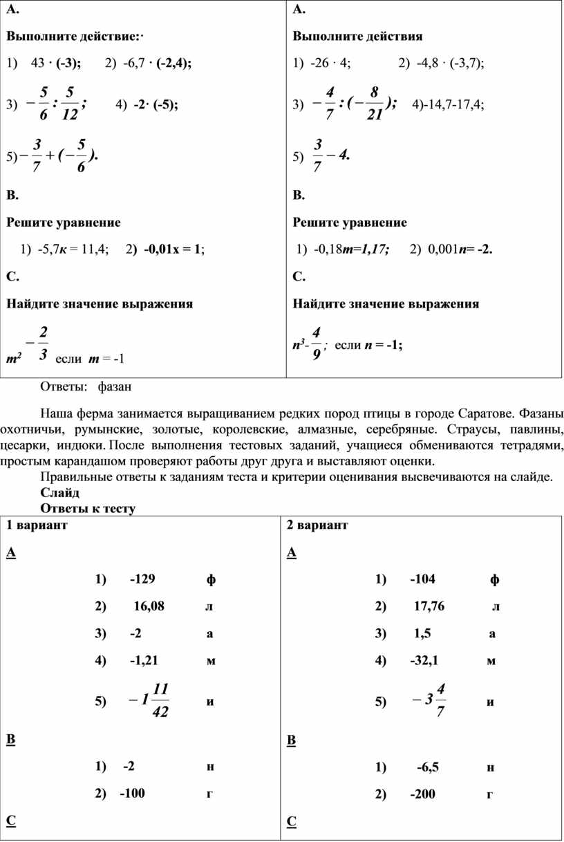 А. Выполните действие:· 1) 43 · (-3); 2) -6,7 · (-2,4); 3) 5) В. Решите уравнение 1) -5,7к = 11,4; 2) -0,01х = 1; С. Найдите значение выражения т2 |
