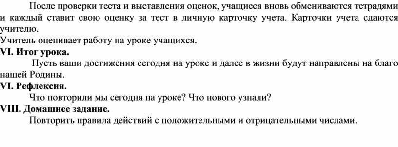 После проверки теста и выставления оценок, учащиеся вновь обмениваются тетрадями и каждый ставит свою оценку за тест в личную карточку учета. Карточки учета сдаются учителю.