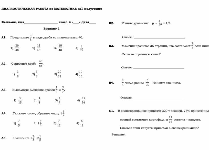 Диагностическая контрольная работа по математике для 6класса за 1 полугодие.