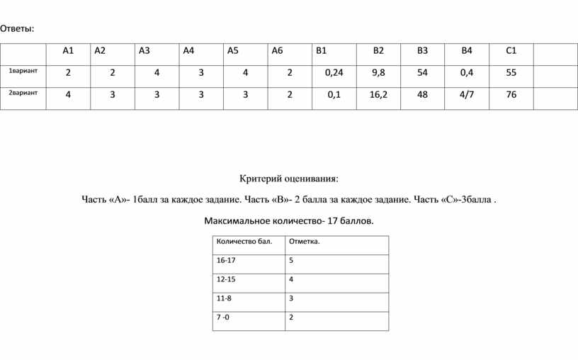 Часть «А»- 1балл за каждое задание. Часть «В»- 2 балла за каждое задание. Часть «С»-3балла .