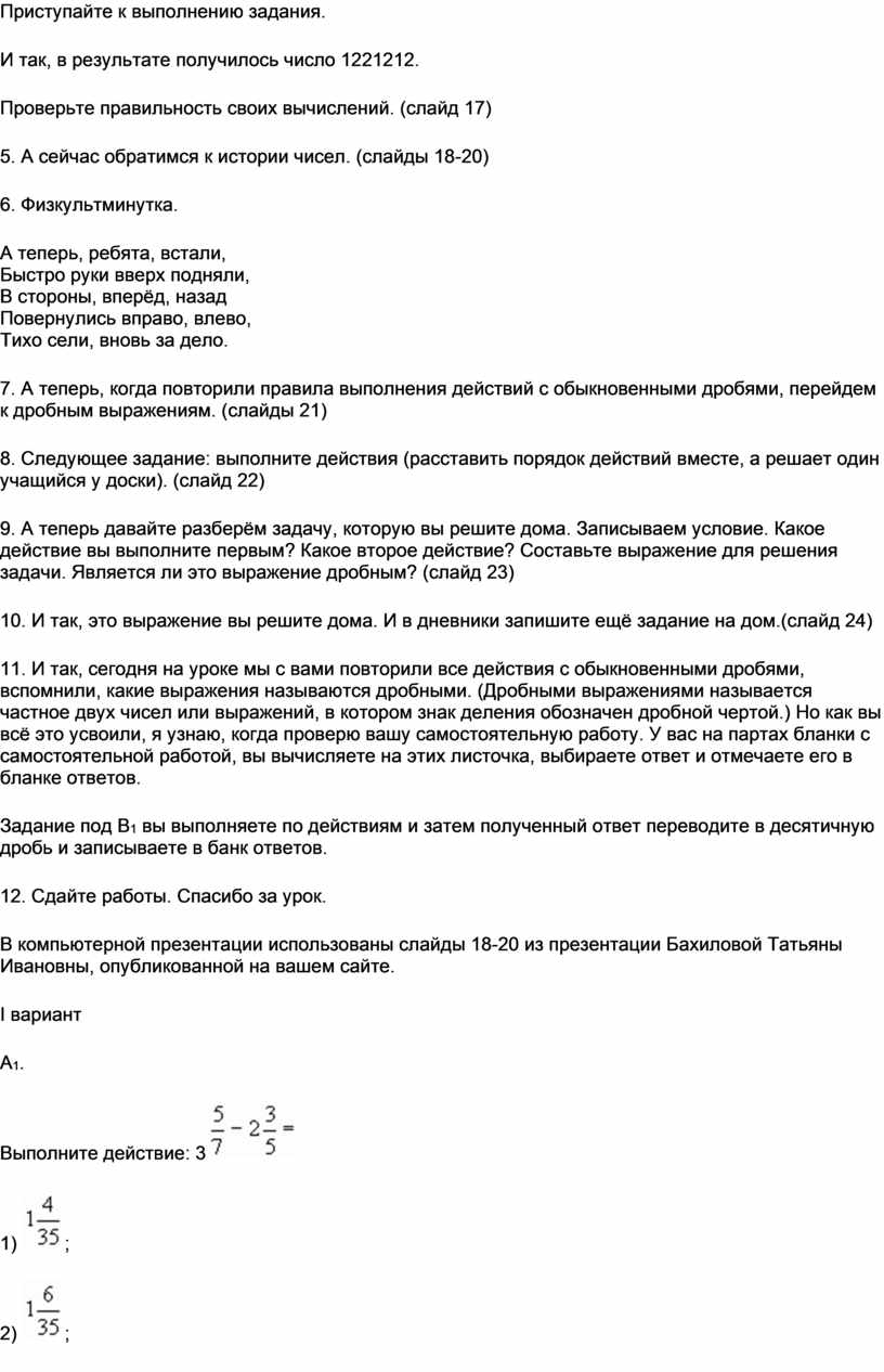 11. И так, сегодня на уроке мы с вами повторили все действия с обыкновенными дробями, вспомнили, какие выражения называются дробными. (Дробными выражениями называется частное двух чисел или выражений, в котором знак деления обозначен дробной чертой.) Но как вы всё это усвоили, я узнаю, когда проверю вашу самостоятельную работу. У вас на партах бланки с самостоятельной работой, вы вычисляете на этих листочка, выбираете ответ и отмечаете его в бланке ответов.