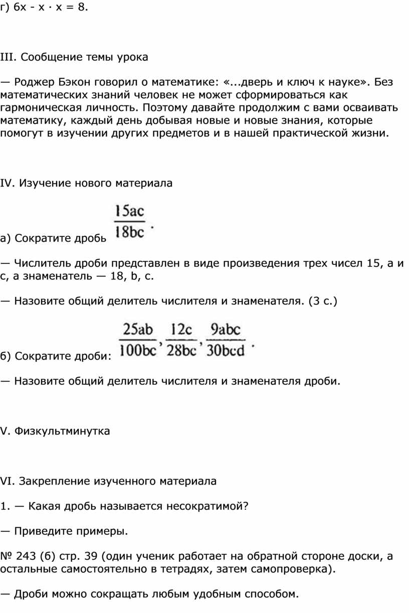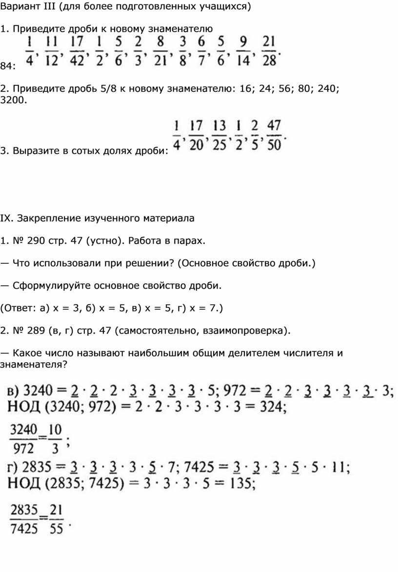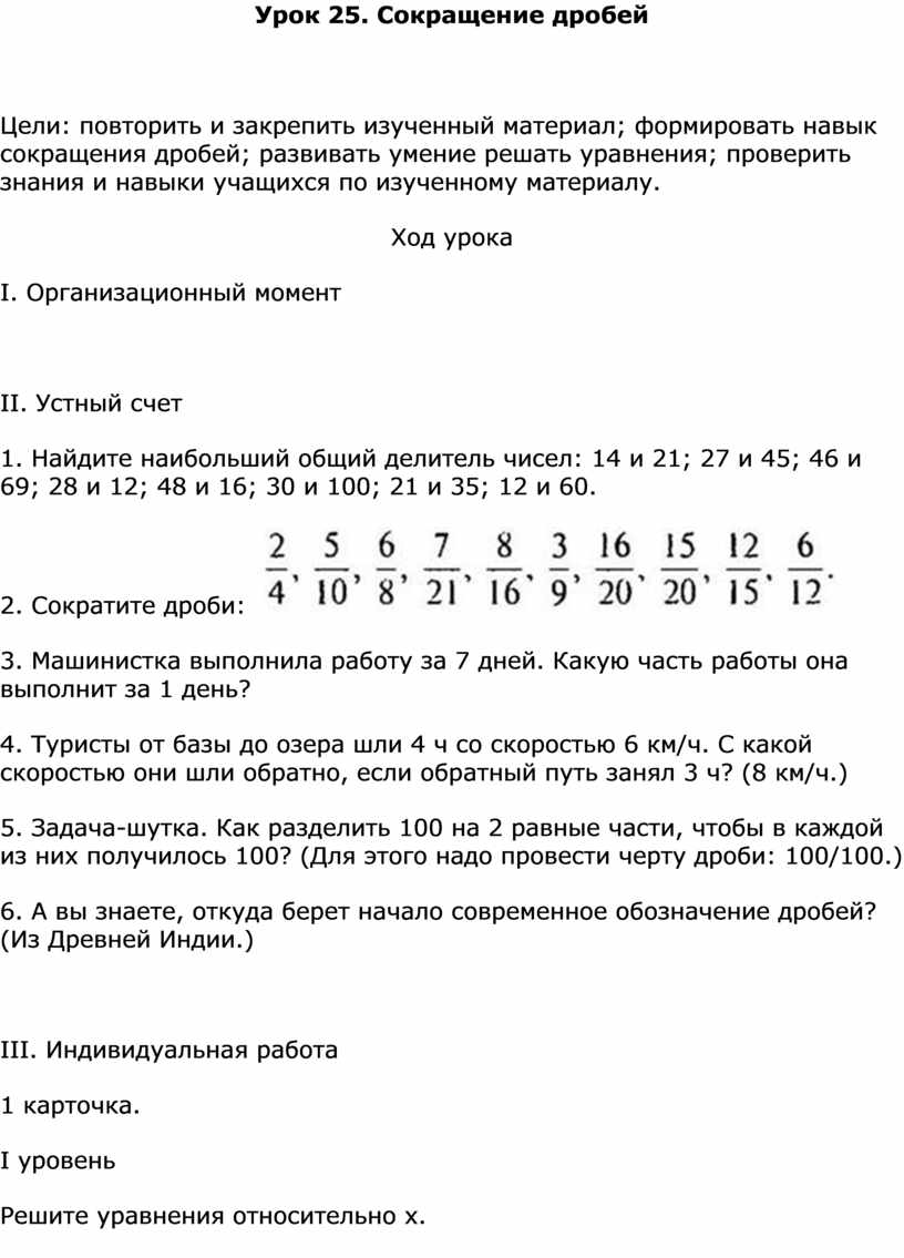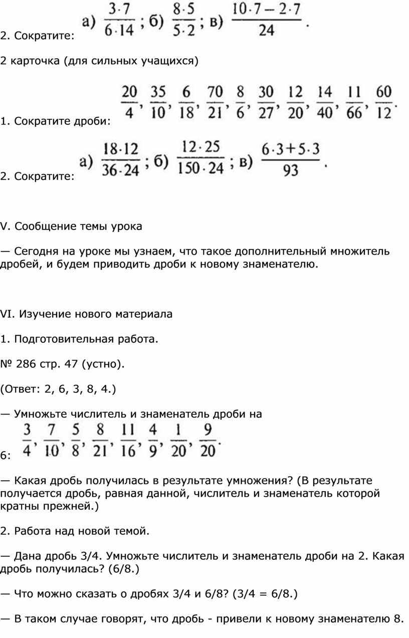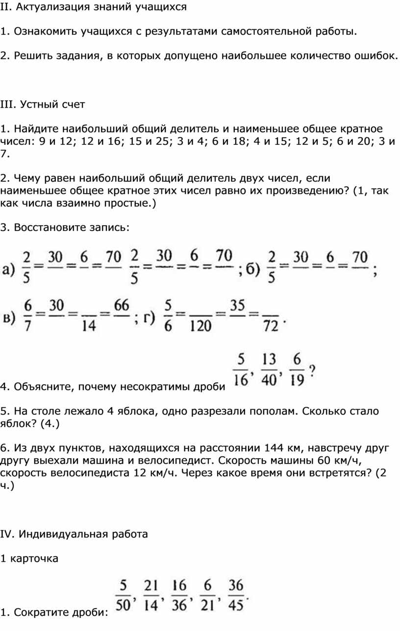 Цели: учить применять основное свойство дроби при выполнении заданий; развивать грамотную математическую речь; совершенствовать сочетание индивидуальной и коллективной форм работы с учащимися; проверить знания и навыки учащихся по изученному материалу.