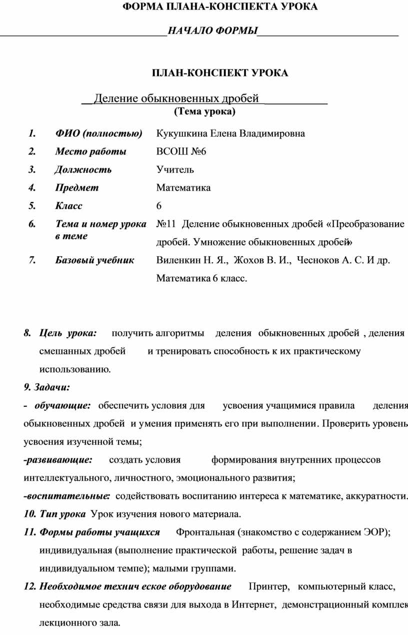 ФОРМА ПЛАНА-КОНСПЕКТА УРОКА