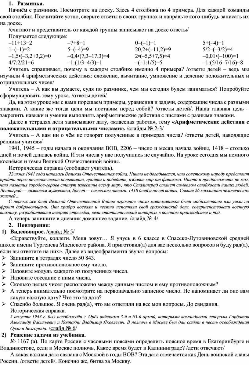 Учитель спрашивает, почему в каждом столбике именно 4 примера? /ответы детей – ведь мы изучили 4 арифметических действия: сложение, вычитание, умножение и деление положительных и отрицательных чисел/