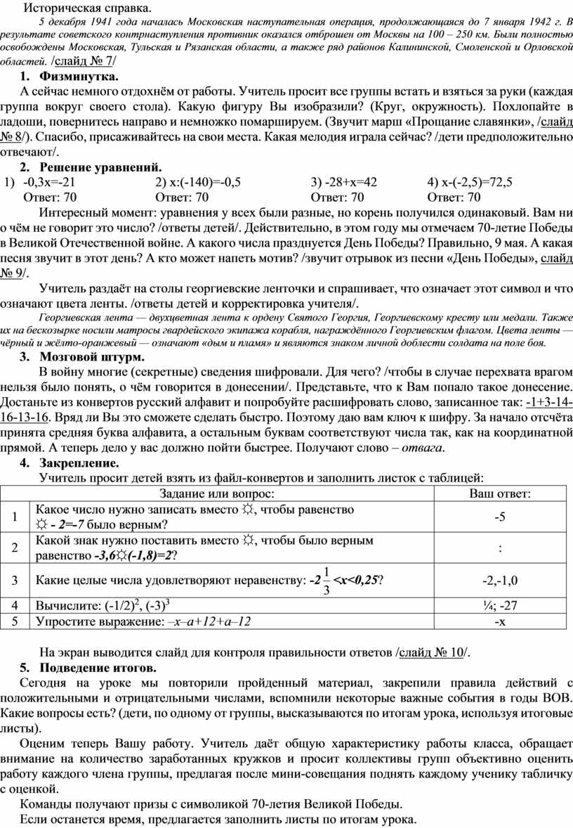 Сегодня на уроке мы повторили пройденный материал, закрепили правила действий с положительными и отрицательными числами, вспомнили некоторые важные события в годы ВОВ. Какие вопросы есть? (дети, по одному от группы, высказываются по итогам урока, используя итоговые листы).