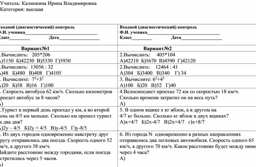 Входной (диагностический) контроль Ф.И. ученика________________________________ Класс_________ Дата__________________