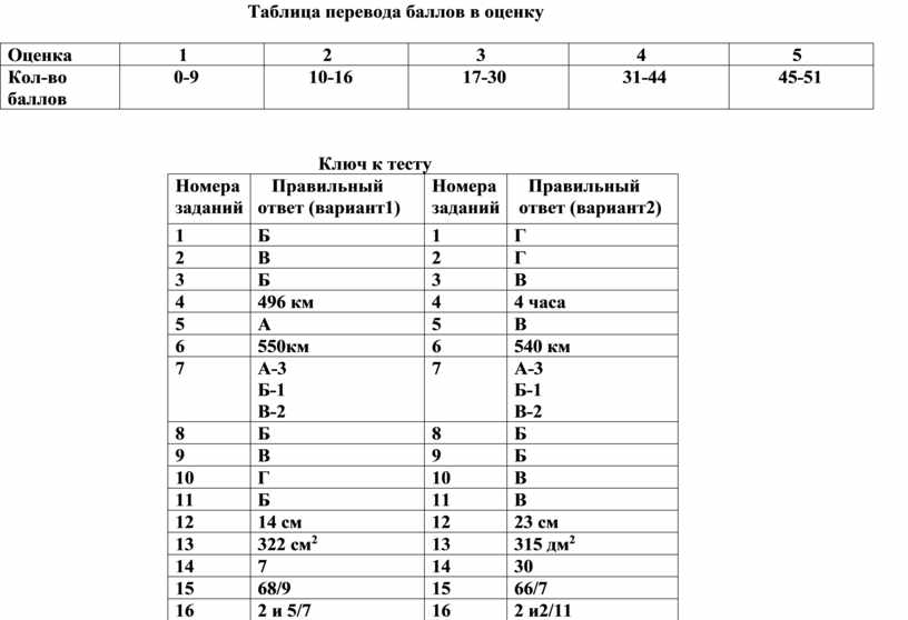 Таблица перевода баллов в оценку