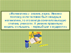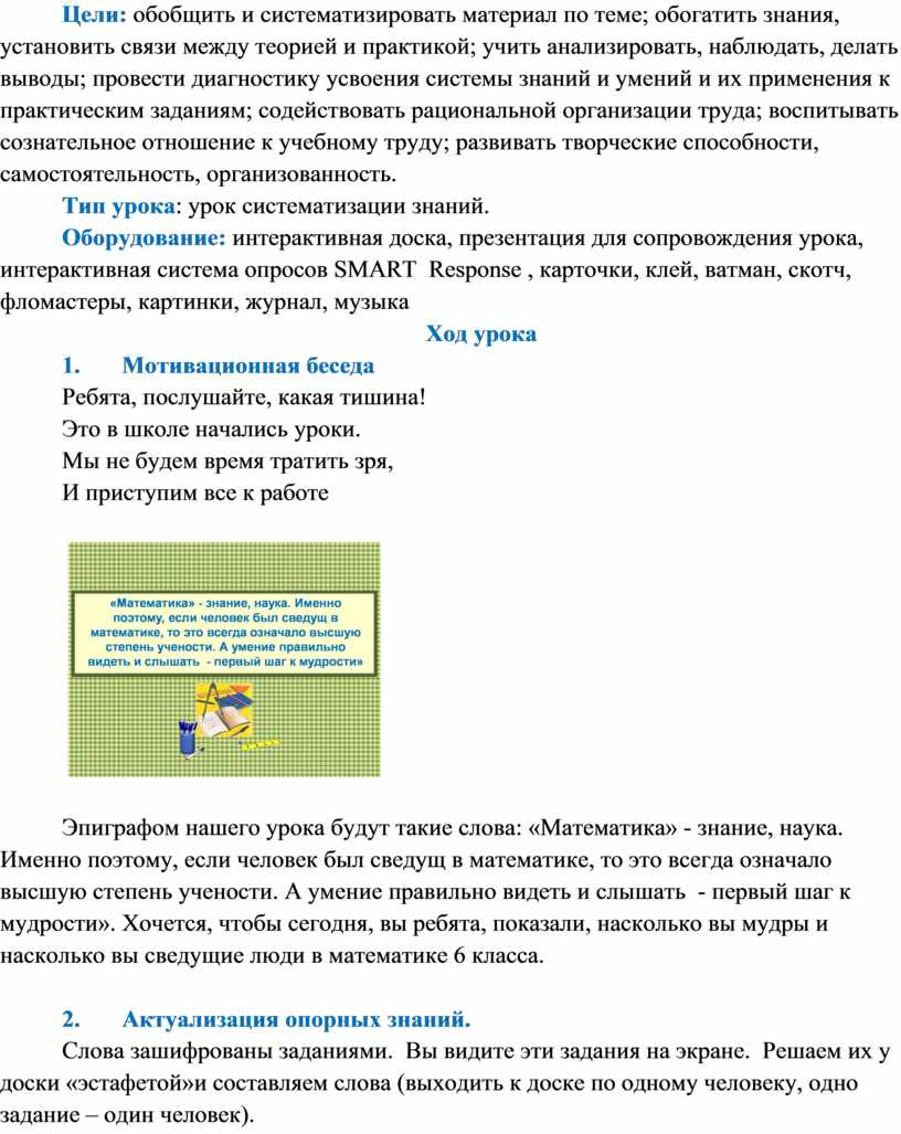Эпиграфом нашего урока будут такие слова: «Математика» - знание, наука. Именно поэтому, если человек был сведущ в математике, то это всегда означало высшую степень учености. А умение правильно видеть и слышать - первый шаг к мудрости». Хочется, чтобы сегодня, вы ребята, показали, насколько вы мудры и насколько вы сведущие люди в математике 6 класса.
