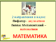 В это время было 2 направления в науке. Первое возглавлял Пифагор, второе – Гиппас Метапонтский.