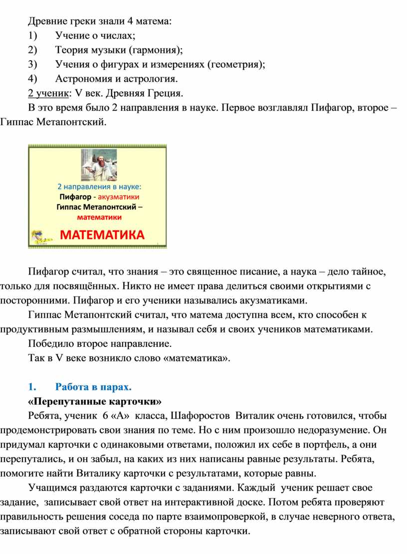 Гиппас Метапонтский считал, что матема доступна всем, кто способен к продуктивным размышлениям, и называл себя и своих учеников математиками.