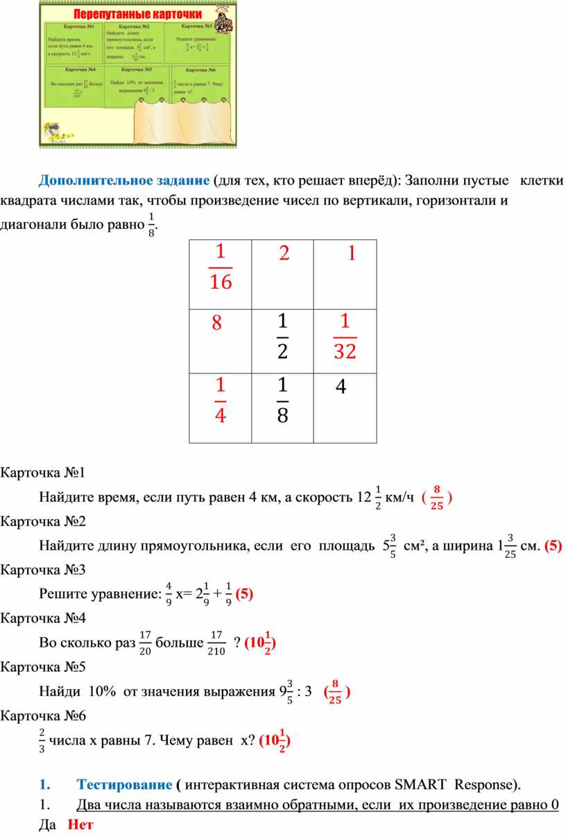 Ребята, ученик 6 «А» класса, Шафоростов Виталик очень готовился, чтобы продемонстрировать свои знания по теме. Но с ним произошло недоразумение. Он придумал карточки с одинаковыми ответами, положил их себе в портфель, а они перепутались, и он забыл, на каких из них написаны равные результаты. Ребята, помогите найти Виталику карточки с результатами, которые равны.