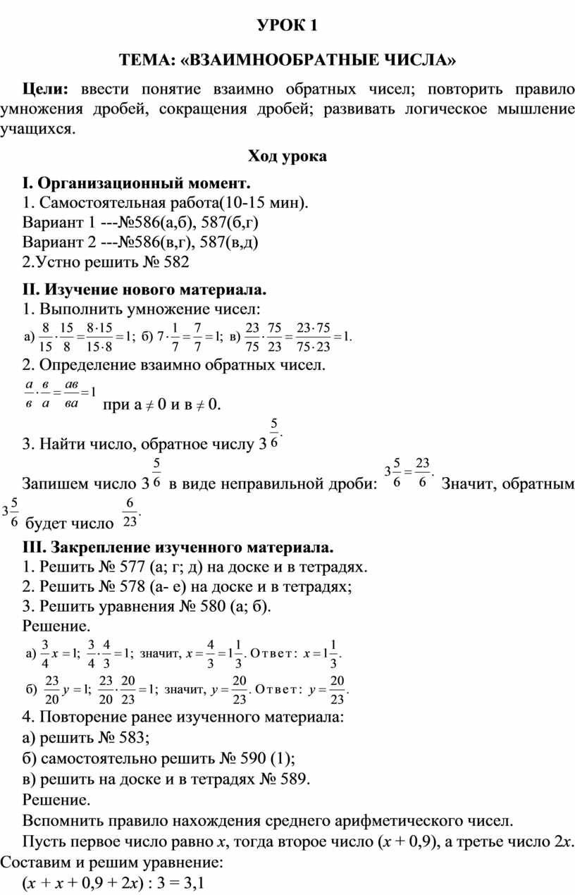 Цели: ввести понятие взаимно обратных чисел; повторить правило умножения дробей, сокращения дробей; развивать логическое мышление учащихся.