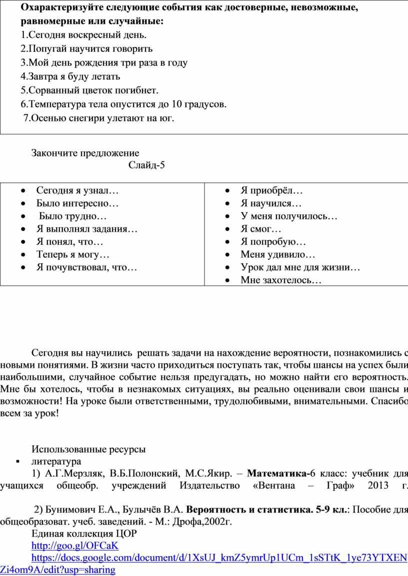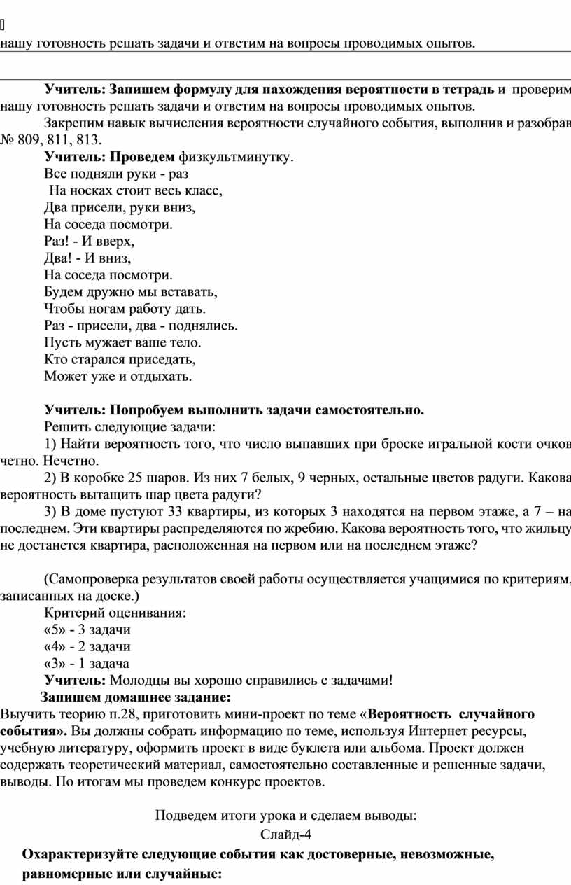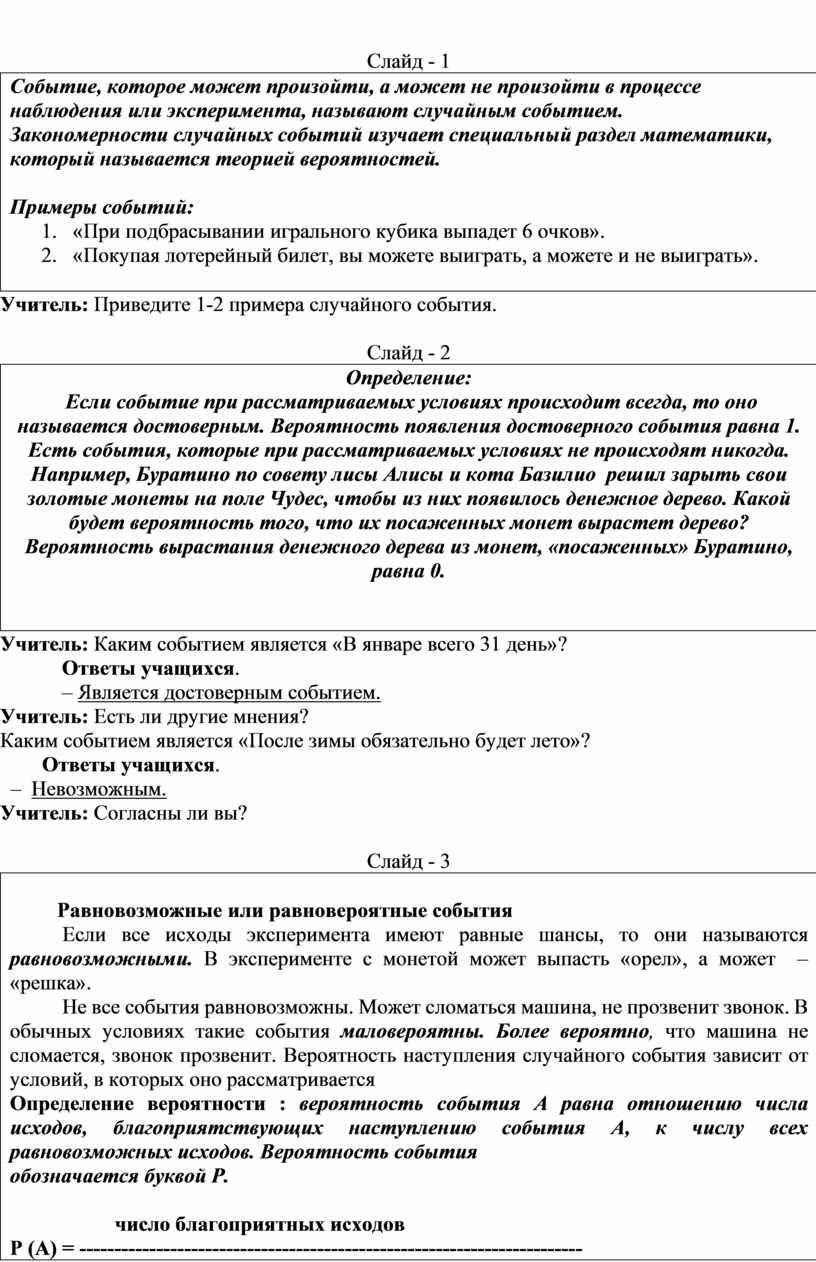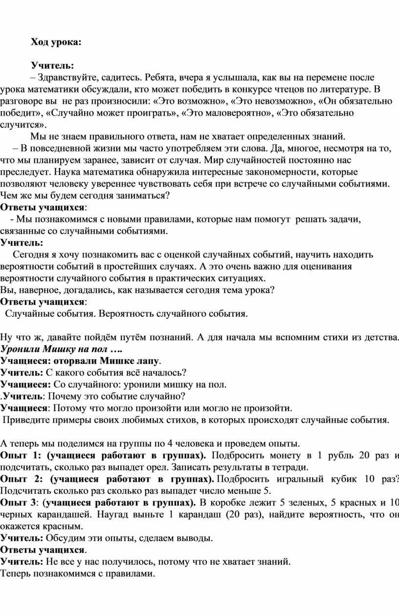 – Здравствуйте, садитесь. Ребята, вчера я услышала, как вы на перемене после урока математики обсуждали, кто может победить в конкурсе чтецов по литературе. В разговоре вы не раз произносили: «Это возможно», «Это невозможно», «Он обязательно победит», «Случайно может проиграть», «Это маловероятно», «Это обязательно случится».