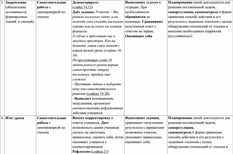 Планирование своей деятельности для решения поставленной задачи, саморегуляция, самоконтроль в форме сравнения способа действия и его результата с заданным эталоном с целью обнаружения отклонений от эталона и внесение необходимых корректив. (регулятивные) Умение слушать и вступать в диалог (коммуникативные) Моральная ответственность перед собой, коллективом и учителем (личностные) |