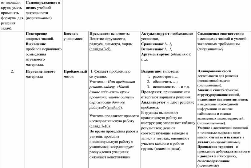 1. Создает проблемную ситуацию. Учитель: - Нам предстоит решить задачу, «Какой длины надо взять кусок проволоки, чтобы согнуть окружность данного радиуса?»(слайд 6). Учитель предлагает провести исследовательскую работу (слайд 7-10). Во время проведения работы учитель проводит индивидуальную работу с учащимися; координирует рассуждения учащихся; оказывает консультации группам, организует беседу и подведение итогов работы. Исторические сведение; вывод формул для вычисления длины окружности (слайд 11-12). |