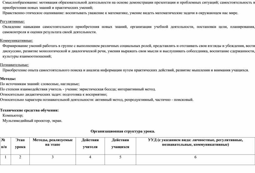 Планирование своей деятельности для решения поставленной задачи (регулятивные). Анализ и синтез объектов, структурирование знаний, подведение под понятие, поиск и выделение необходимой информации на основе наблюдения и оценки выявленных закономерностей. (познавательные). Умение с достаточной полнотой и точностью выражать свои мысли, слушать и вступать в диалог (коммуникативные). Проявление терпения и проявление доброжелательности и доверия к собеседнику, смыслообразование (личностные) |