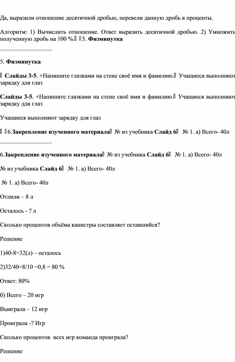 № 1. а) Всего- 40л Отлили – 8 л Осталось - ? л Сколько процентов объёма канистры составляет оставшийся? Решение 1)40-8=32(л) – осталось 2)32/40=8/10 =0,8 = 80 % Ответ: 80% б) Всего – 20 игр Выиграла – 12 игр Проиграла -? Игр Сколько процентов всех игр команда проиграла? Решение 1)20-12 = 8(игр) – проиграла 8/20= 4/10= 0,4 = 40 % Ответ: 40 % № 2. Голосование – 1:4 Сколько процентов учащихся проголосовали за победителя и сколько за проигравшего? Решение 1) 4:5 = 0,8 = 80% за победителя 2)1:5 = 0,2 = 20% за проигравшего Ответ: за победителя -80%, за проигравшего -20%