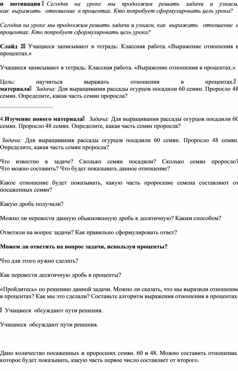 известно в задаче? Сколько семян посадили? Сколько семян проросло? Какое отношение будет показывать, какую часть проросшие семена составляют от посаженных семян? Какую дробь получили? Можно ли перевести данную обыкновенную дробь в десятичную? Каким способом? Ответили на вопрос задачи? Как правильно сформулировать ответ? Можем ли ответить на вопрос задачи, используя проценты? Что для этого нужно сделать? Как перевести десятичную дробь в проценты? «Пройдитесь» по решению данной задачи. Можно ли сказать, что мы выразили отношение в процентах? Как мы это сделали? Составьте алгоритм выражения отношения в процентах. |