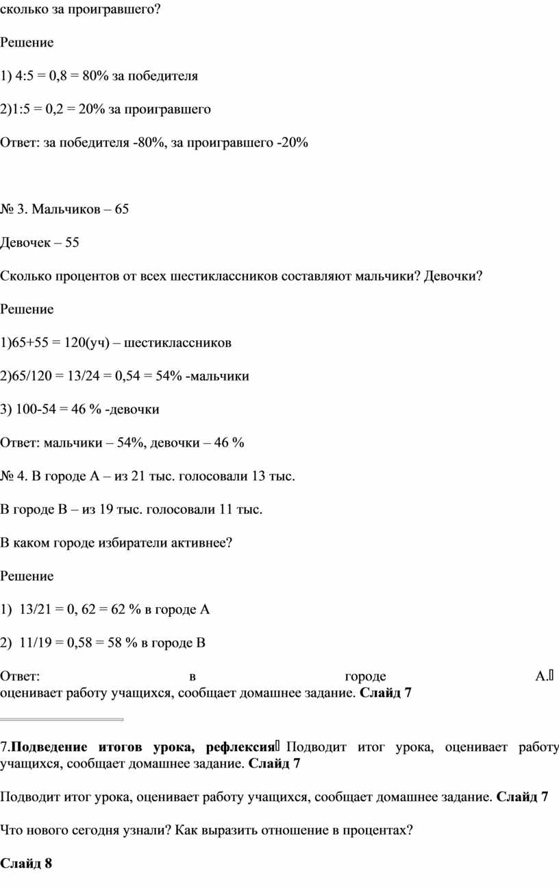 № 3. Мальчиков – 65 Девочек – 55 Сколько процентов от всех шестиклассников составляют мальчики? Девочки? Решение 1)65+55 = 120(уч) – шестиклассников 2)65/120 = 13/24 = 0,54 = 54% -мальчики 3) 100-54 = 46 % -девочки Ответ: мальчики – 54%, девочки – 46 % № 4. В городе А – из 21 тыс. голосовали 13 тыс. В городе В – из 19 тыс. голосовали 11 тыс. В каком городе избиратели активнее? Решение 1) 13/21 = 0, 62 = 62 % в городе А 2) 11/19 = 0,58 = 58 % в городе В Ответ: в городе А. |