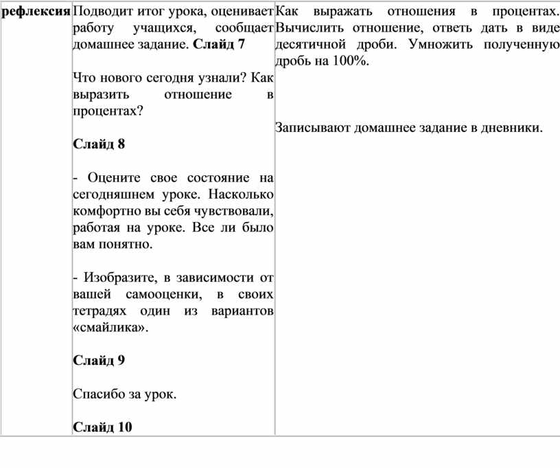 Подводит итог урока, оценивает работу учащихся, сообщает домашнее задание. Слайд 7 Что нового сегодня узнали? Как выразить отношение в процентах? Слайд 8 - Оцените свое состояние на сегодняшнем уроке. Насколько комфортно вы себя чувствовали, работая на уроке. Все ли было вам понятно. - Изобразите, в зависимости от вашей самооценки, в своих тетрадях один из вариантов «смайлика». Слайд 9 Спасибо за урок. Слайд 10 |