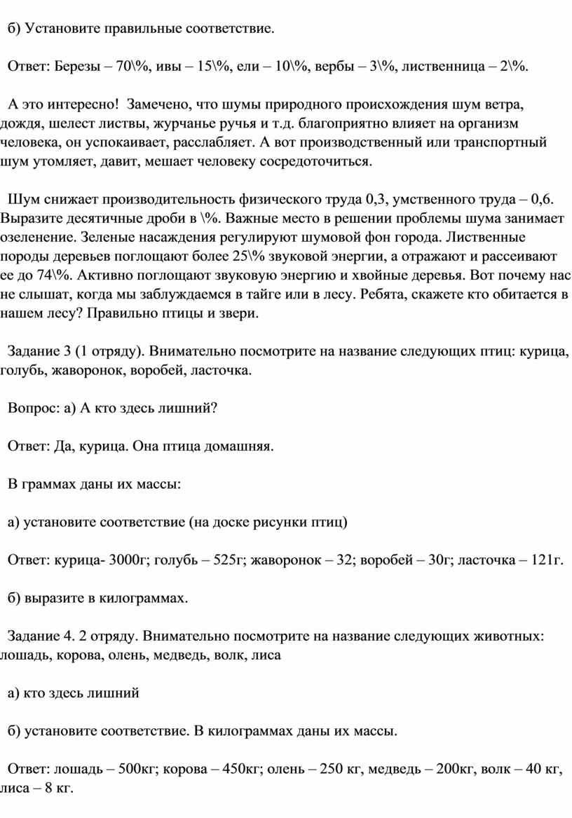 Шум снижает производительность физического труда 0,3, умственного труда – 0,6. Выразите десятичные дроби в \%. Важные место в решении проблемы шума занимает озеленение. Зеленые насаждения регулируют шумовой фон города. Лиственные породы деревьев поглощают более 25\% звуковой энергии, а отражают и рассеивают ее до 74\%. Активно поглощают звуковую энергию и хвойные деревья. Вот почему нас не слышат, когда мы заблуждаемся в тайге или в лесу. Ребята, скажете кто обитается в нашем лесу? Правильно птицы и звери.