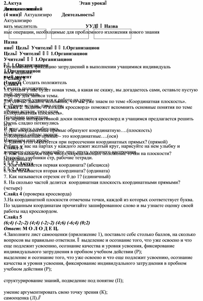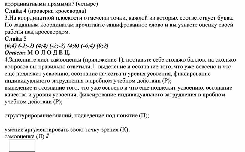 Слайд 1 1.Сегодня у нас будет новая тема, а какая не скажу, вы догадаетесь сами, оставьте пустую строчку для записи темы. 2.А сейчас давайте вспомним, что мы уже знаем по теме «Координатная плоскость». Слайд 2. Задание «Разгадай кроссворд» поможет вспомнить основные понятия по теме «Координатная плоскость». На экране интерактивной доски появляется кроссворд и учащимся предлагается решить его. 1. Две координатные прямые образуют координатную….(плоскость) 2. Координатные прямые - это координатные….(оси) 3. Какой угол образуется при пересечении координатных прямых? (прямой) Слайд 3. 4. Как называется пара чисел, определяющих положение точки на плоскости? (координата) 5. Как называется первая координата? (абсцисса) 6. Как называется вторая координата? (ордината) 7. Как называется отрезок от 0 до 1? (единичный) 8. На сколько частей делится координатная плоскость координатными прямыми? (четыре) Слайд 4 (проверка кроссворда) 3.На координатной плоскости отмечены точки, каждой из которых соответствует буква. По заданным координатам прочитайте зашифрованное слово и вы узнаете оценку своей работы над кроссвордом. Слайд 5 (6;4) (-2;-2) (4;4) (-2;-2) (4;6) (-6;4) (0;2) Ответ: М О Л О Д Е Ц. 4.Заполните лист самооценки (приложение 1), поставьте себе столько баллов, на сколько вопросов вы правильно ответили. |