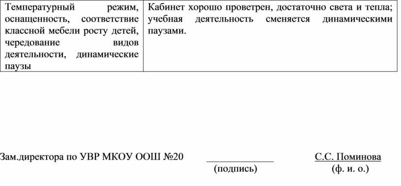 Температурный режим, оснащенность, соответствие классной мебели росту детей, чередование видов деятельности, динамические паузы |
