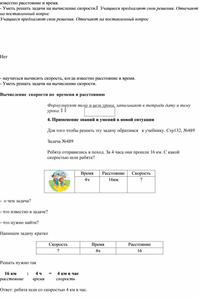 Решать нужно так 16 км : 4 ч = 4 км в час расстояние время скорость Ответ: ребята шли со скоростью 4 км в час. Как узнать скорость движения, если известны расстояние и время?