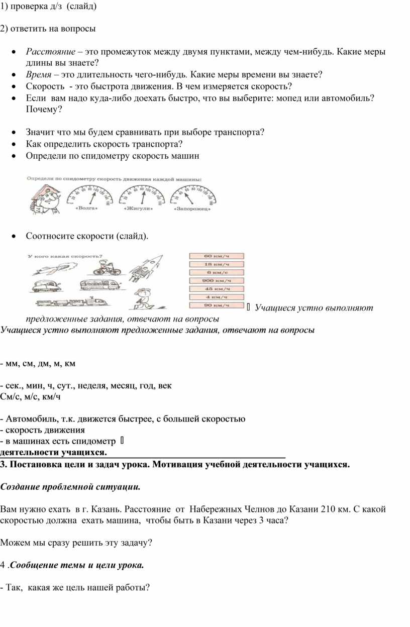 3. Постановка цели и задач урока. Мотивация учебной деятельности учащихся. Создание проблемной ситуации. Вам нужно ехать в г. Казань. Расстояние от Набережных Челнов до Казани 210 км. С какой скоростью должна ехать машина, чтобы быть в Казани через 3 часа? Можем мы сразу решить эту задачу? 4 .Сообщение темы и цели урока. - Так, какая же цель нашей работы?