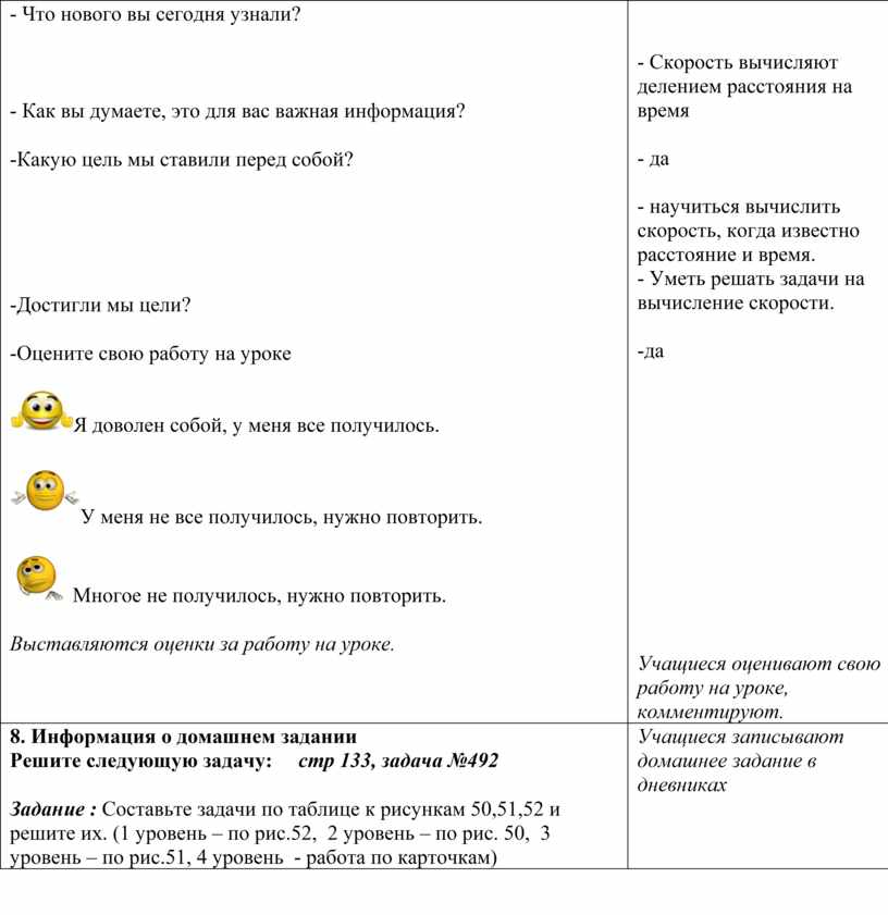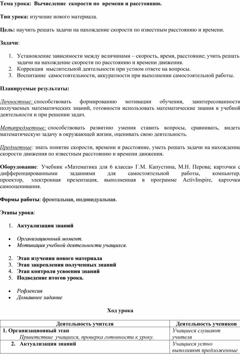 - научиться вычисить скорость, когда известно расстояние и время. - Уметь решать задачи на вычисление скорости. Вычисление скорости по времени и расстоянию Формулируют тему и цель урока, записывают в тетради дату и тему урока. |