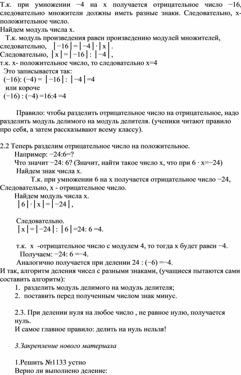 2.1. Деление отрицательных чисел имеет тот же смысл, что и деление положительных чисел. т.е. по заданному произведению и одному из множителей