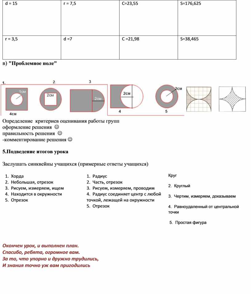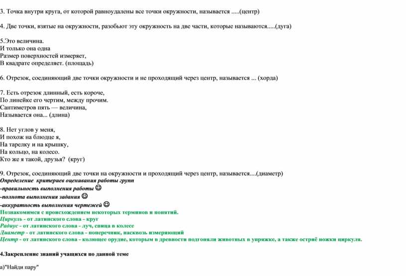 Круг 2. Круглый 3. Чертим, измеряем, доказываем 4. Равноудаленный от центральной точки 5. Простая фигура