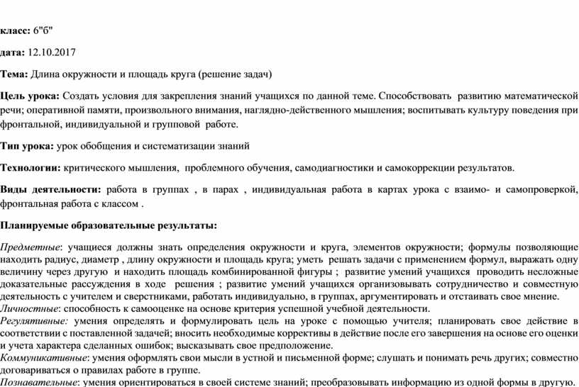 Предметные: учащиеся должны знать определения окружности и круга, элементов окружности; формулы позволяющие находить радиус, диаметр , длину окружности и площадь круга; уметь решать задачи с применением формул, выражать одну величину через другую и находить площадь комбинированной фигуры ; развитие умений учащихся проводить несложные доказательные рассуждения в ходе решения ; развитие умений учащихся организовывать сотрудничество и совместную деятельность с учителем и сверстниками, работать индивидуально, в группах, аргументировать и отстаивать свое мнение.