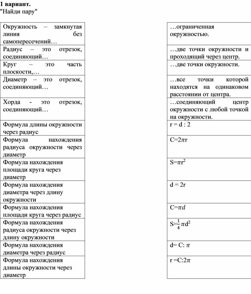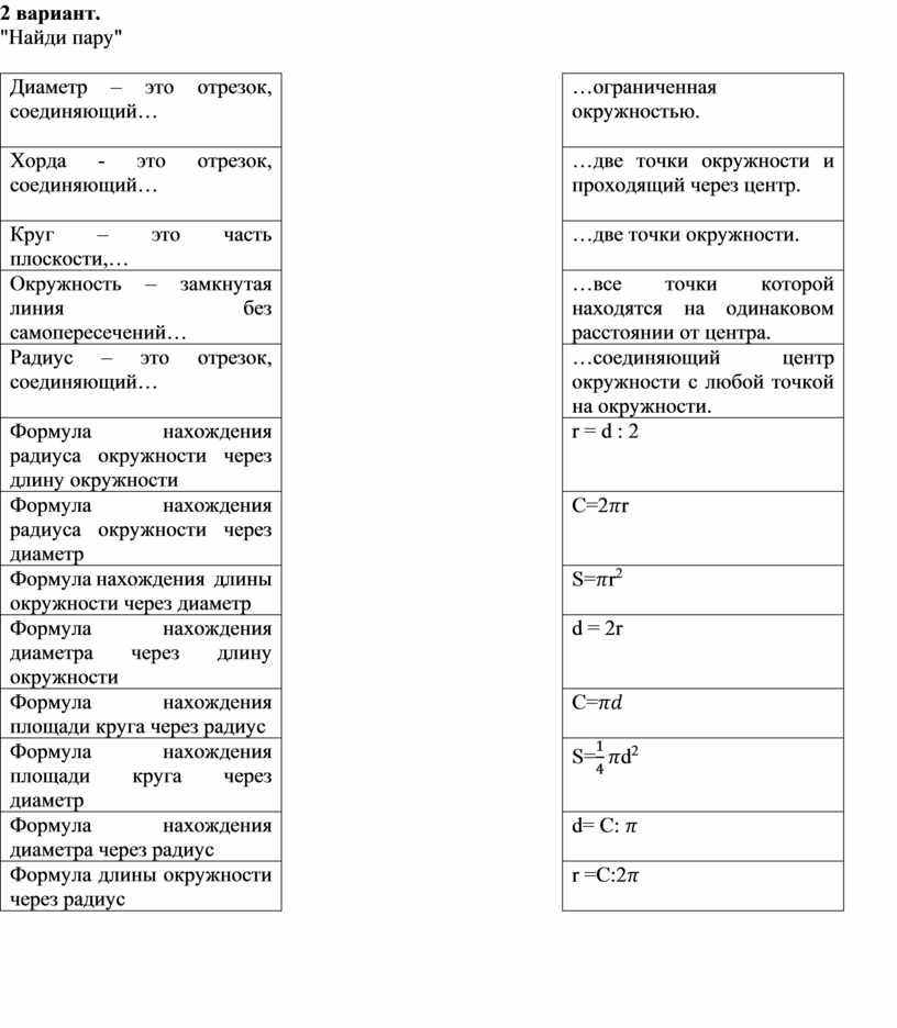 Индивидуальная работа учащихся по вариантам. Найти начало и конец определения, установить соответствие названием и формулой
